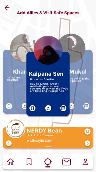 After reiteration and user testing the wireframes, I developed a basic user flow. Individuals can use the platform to choose nearby allies during the trip. The allies will have live access to the updates of the trip and potential danger. Primary functionalities include rating pathways, safe spaces, and finding allies nearby.
